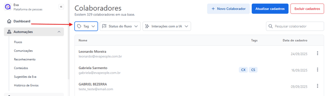 Você também pode filtrar os colaboradores por tags para visualizar quem está vinculado a cada uma delas.