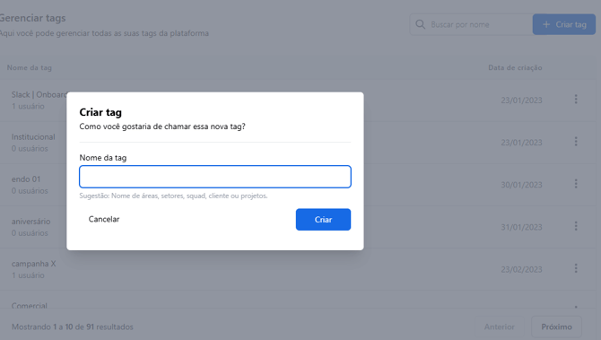 - Clique em + Criar Tag no canto superior direito da tela.
