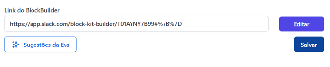 Para salvar um comunicado para uso futuro, copie a URL da página de edição e cole no campo “Link do BlockBuilder” na Eva. Isso garante que o conteúdo esteja acessível e reaproveitável por toda a equipe.