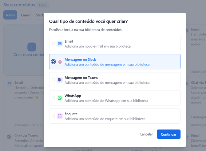 Para criar um comunicado no Slack, a forma mais simples é criar um novo contéudo de Slack ou utilizar um dos templates disponíveis na biblioteca de conteúdos. Basta selecionar o comunicado desejado (novo ou duplicado).
