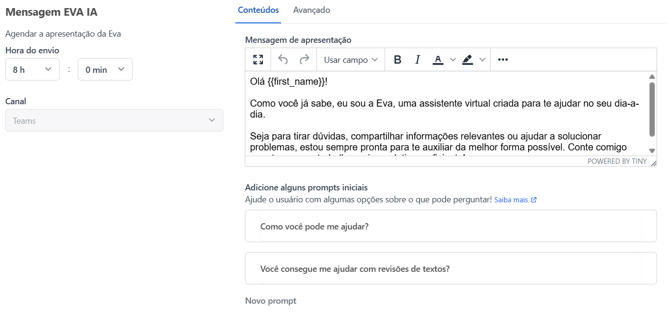 Envie mensagens proativas com a Eva IA para aumentar engajamento. Aprenda a configurar horário, prompt e perguntas nos fluxos para estimular interações e apoiar processos como onboarding e comunicação interna.