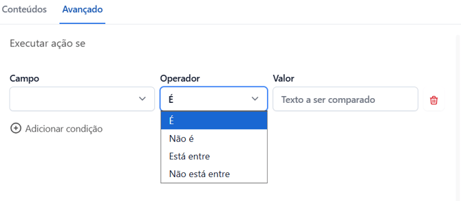Ao configurar uma condicional, você poderá escolher como o sistema irá avaliar o campo do colaborador. Abaixo estão os operadores e exemplos de uso: