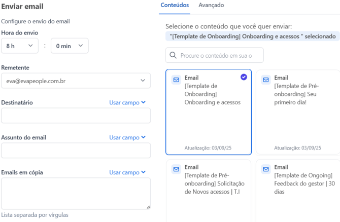 O e-mail é um dos canais mais utilizados dentro dos fluxos da EVA, permitindo enviar comunicações automáticas e personalizadas para colaboradores, gestores ou outros envolvidos. Por ser um canal formal e amplamente acessível, é essencial configurá-lo corretamente para garantir clareza, entrega e engajamento.