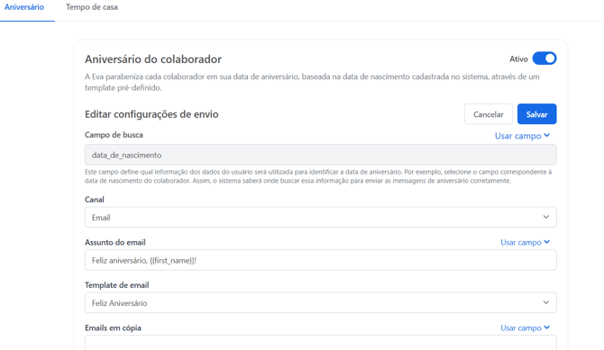 Após salvar, a Eva enviará automaticamente o e-mail ou mensagem na data do aniversário de cada colaborador — sem necessidade de qualquer ação manual.