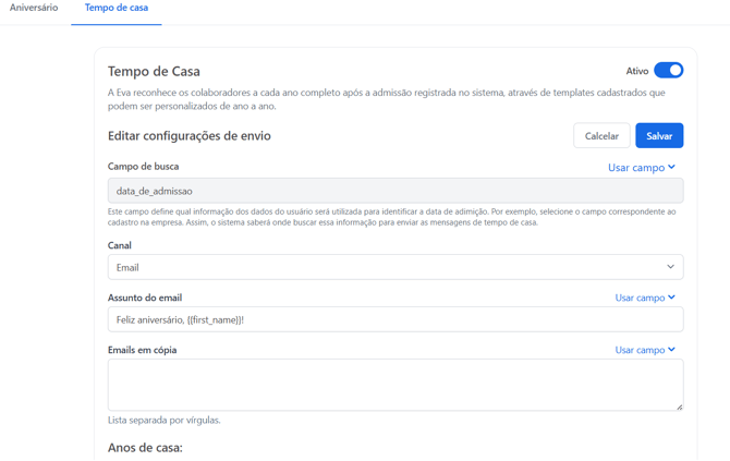 Após a configuração, a Eva enviará automaticamente a mensagem de parabéns no dia exato do aniversário de admissão do colaborador, conforme os anos definidos.