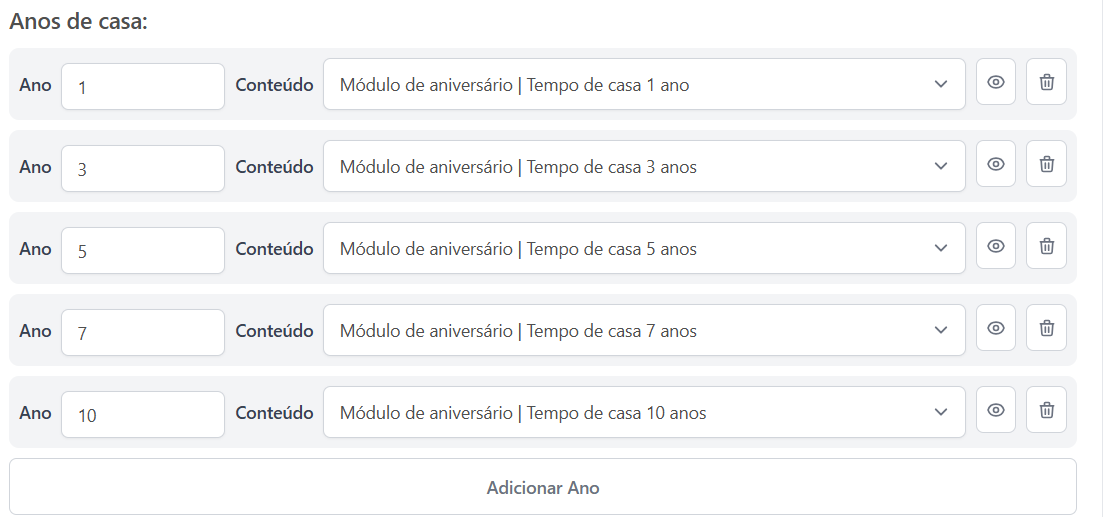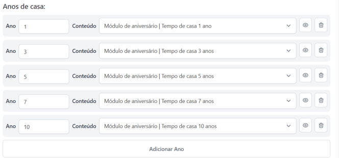 Na aba de tempo de casa, é possível definir múltiplos anos de reconhecimento, como 1, 2, 3, 5, 10 anos etc.